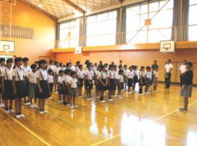 そのあと,高学年が体育館の準備をしました。 椅子を拭いたり,ほうきではいたり, 一生懸命に掃除をしている姿が見られ,頼もしい高学年ですね。 「ここをそうじしてもいいですか」 「このドアやガラス窓を拭いてもいいですか」と仕事を探している人もいました。 |